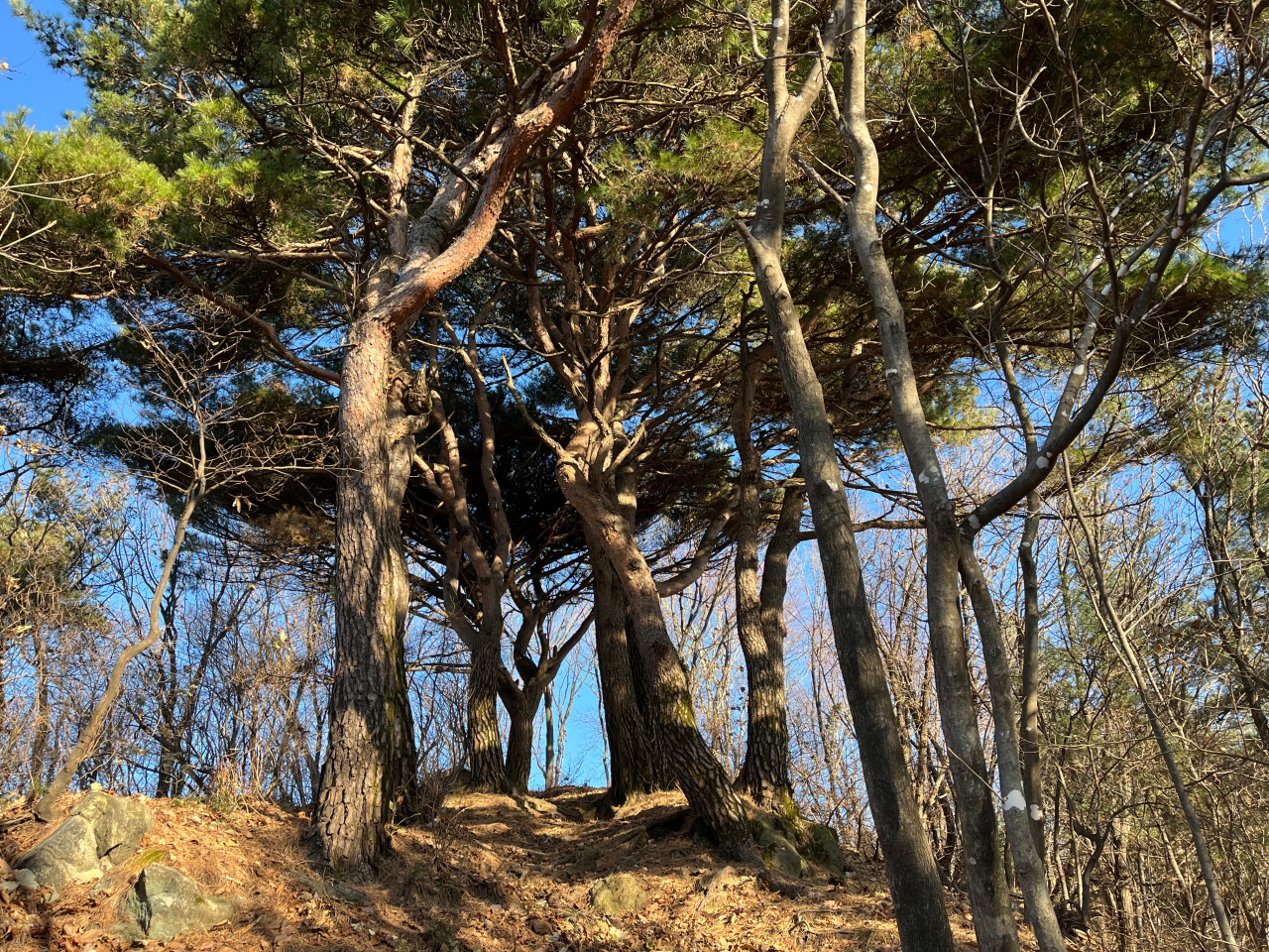 ^ 오름길을 오르다가 수령이 오래 된 멋진 소나무 사이를 오르며 다시 내리막길과 오르막길이 연속이다.